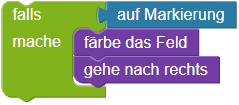 Alle Befehle die nach dem Doppelpunkt eingerückt stehen, werden ausgeführt, falls die Bedingung "True" ist. In diese Fall also: Wenn das Feld markiert ist, dann bemahlt der Roboter das Feld und geht einen Schritt nach rechts.